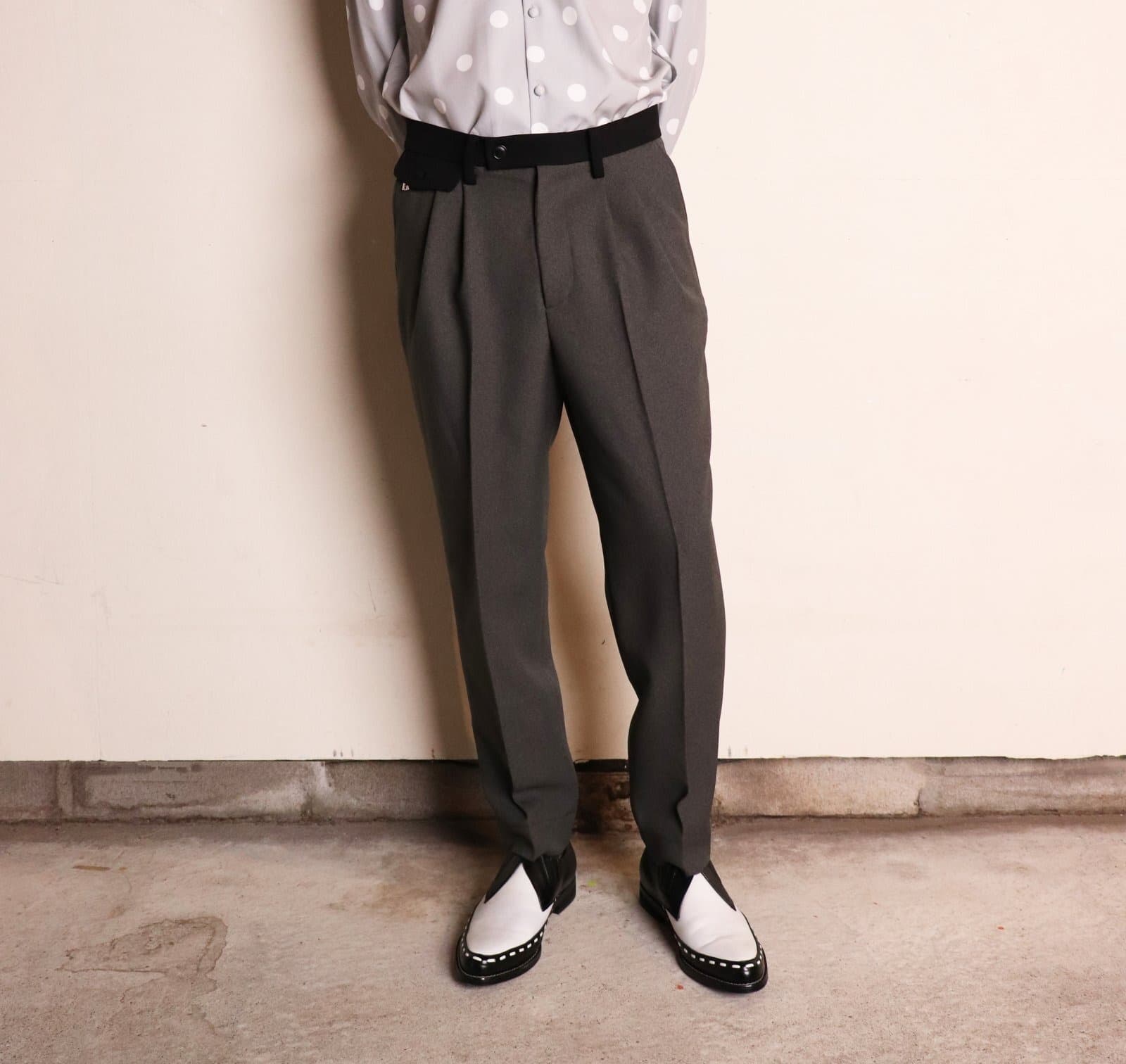 2タックが入った太いワタリから強めの角度でテーパードしていくシルエット。
