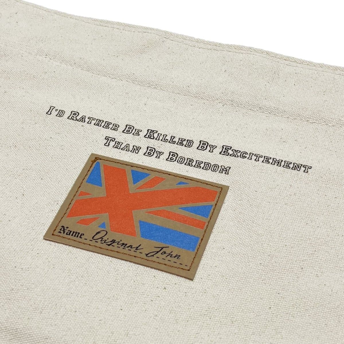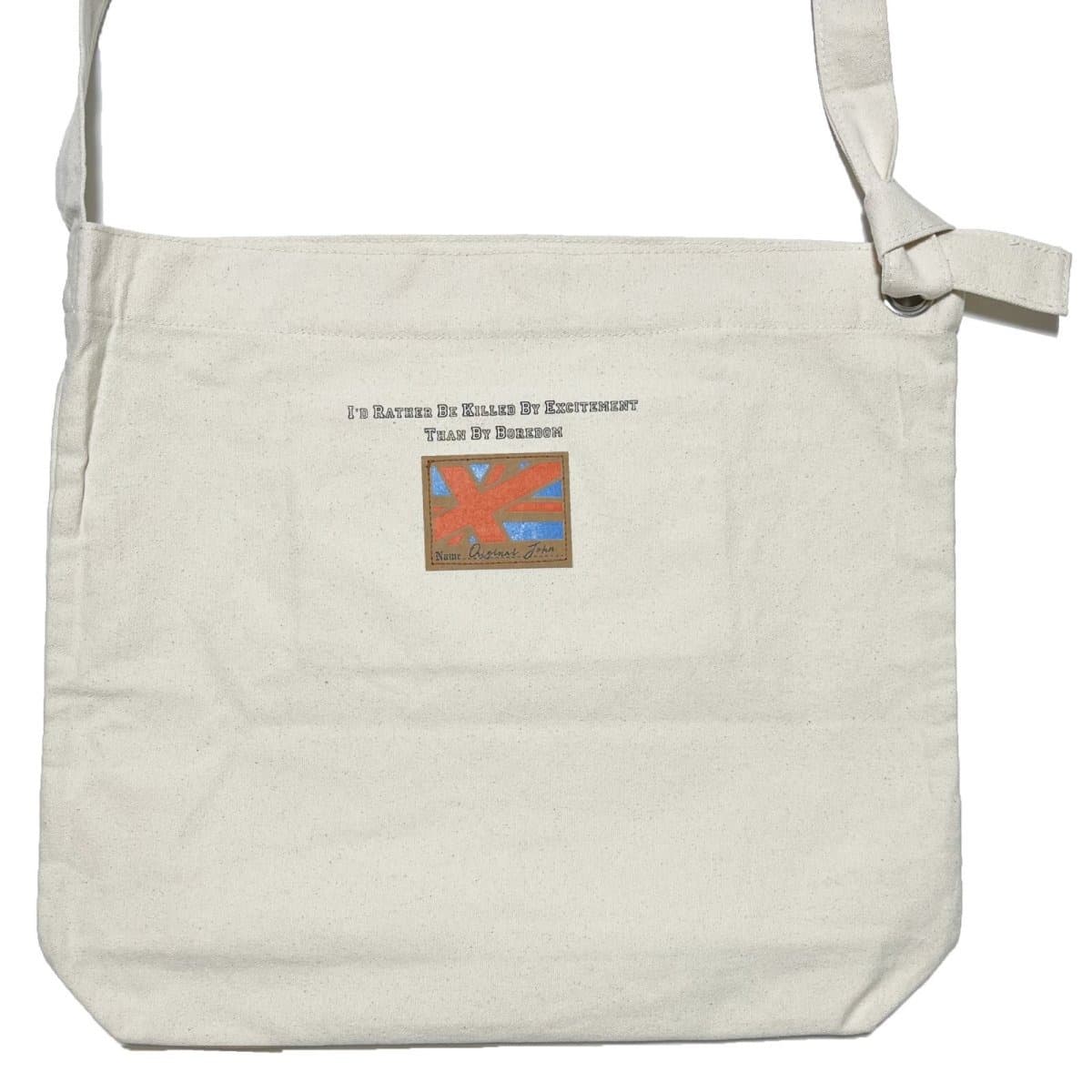 背面に「I'D RATHER BE KILLED BY EXCITEMENT THAN BY BOREDOM」(退屈に殺られるよりは興奮に殺られたいんだ)、紙パッチ付き。