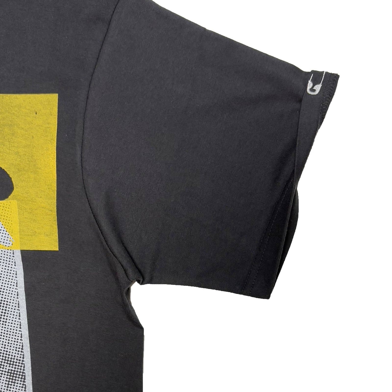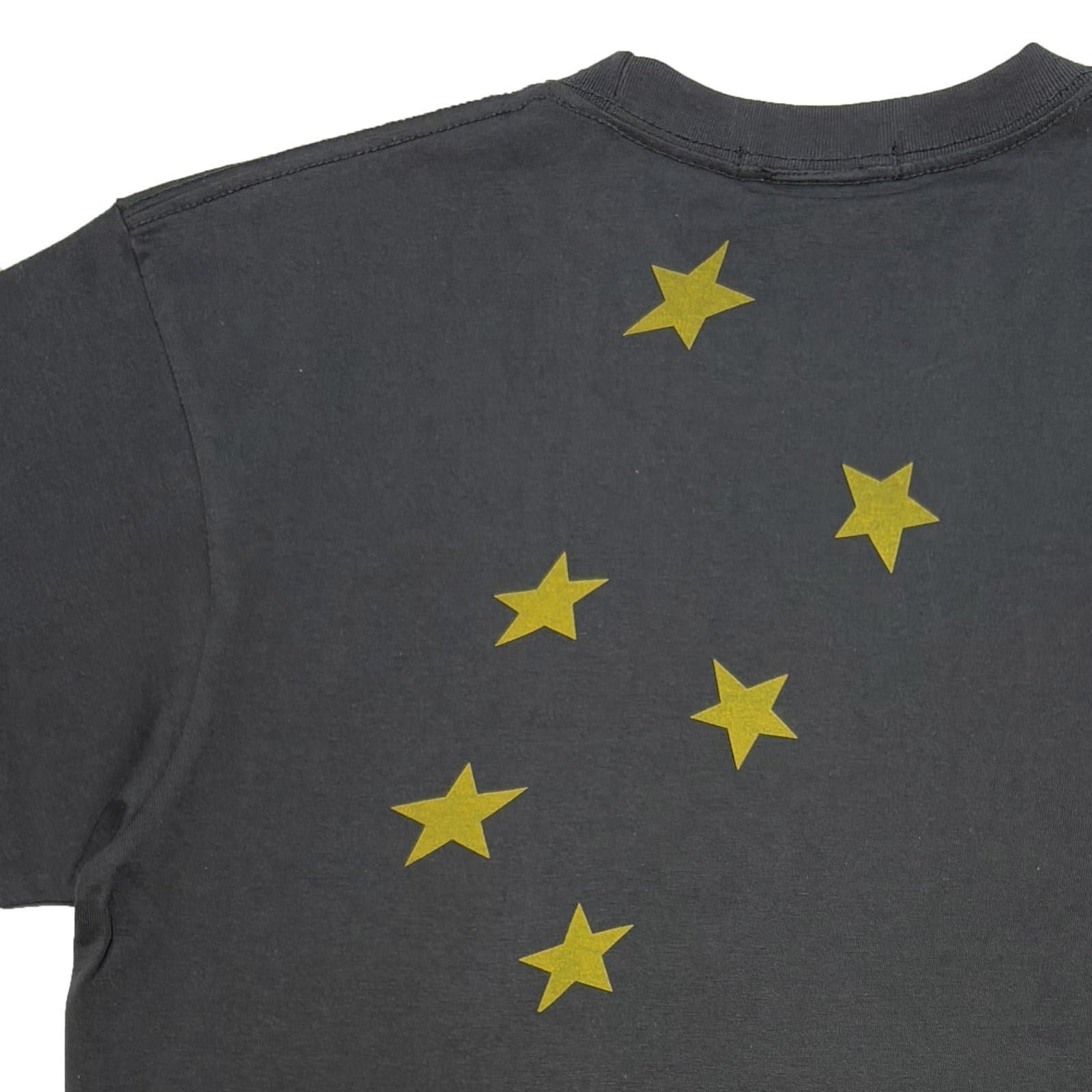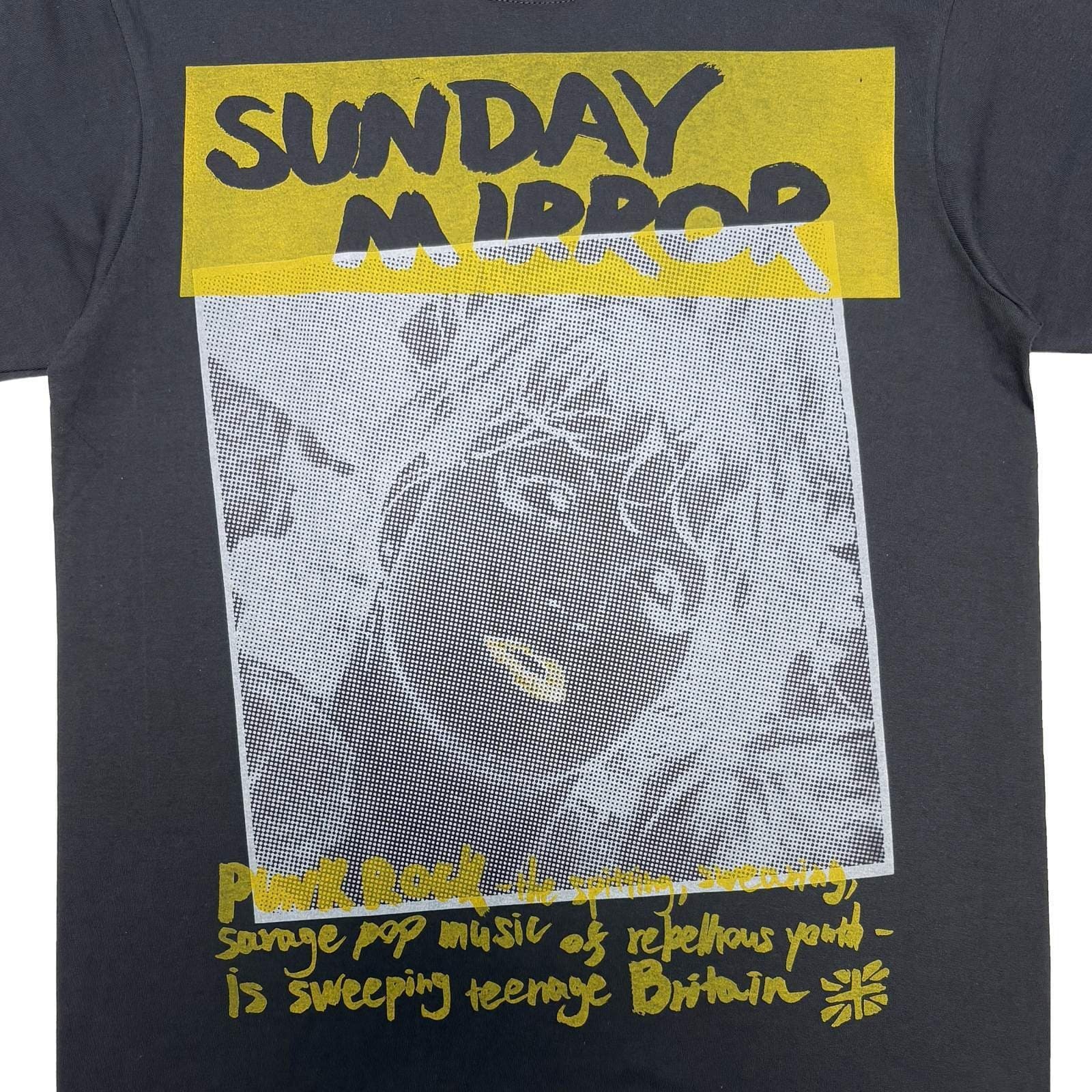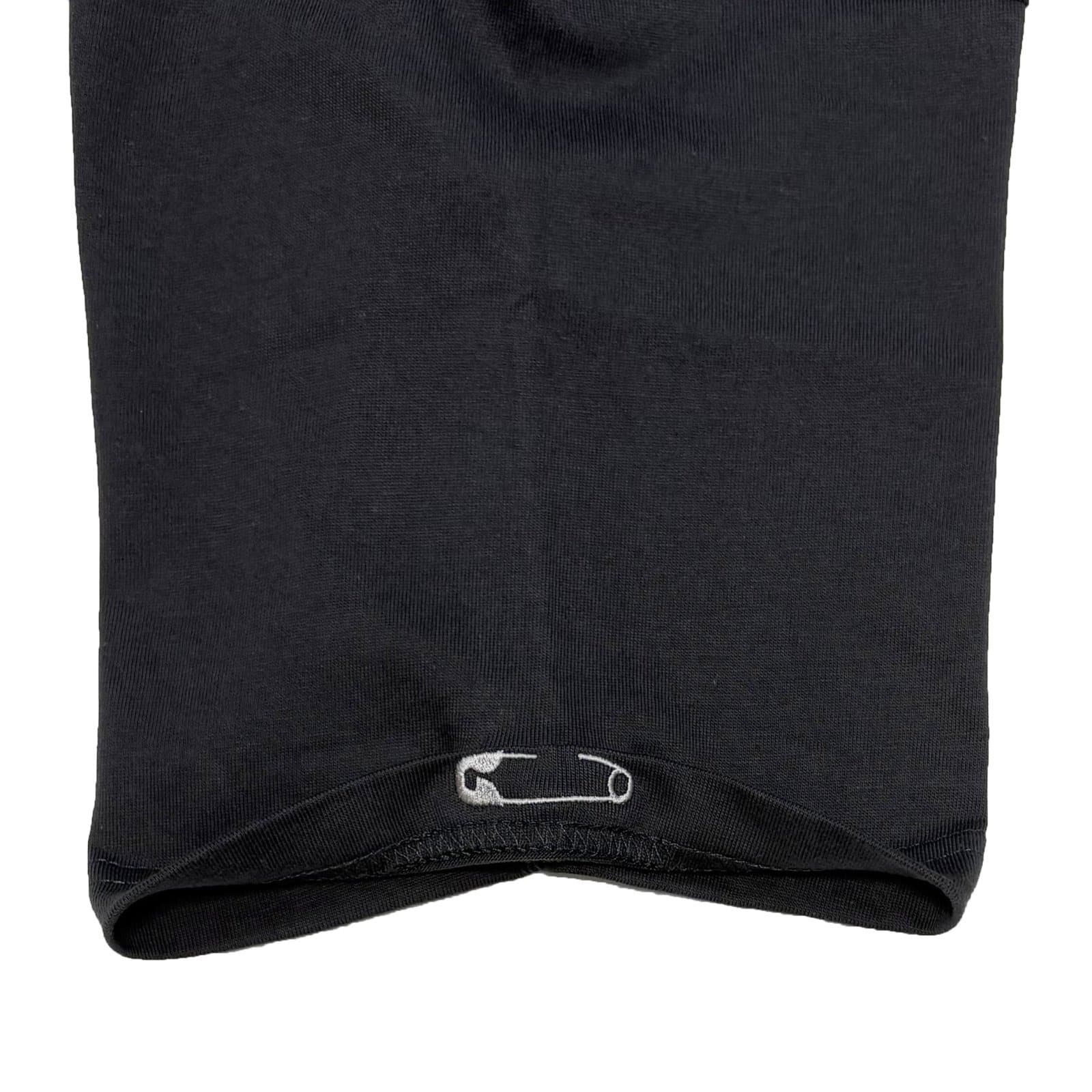 背面に"歪んだスター"プリント、めくられた左袖口に"安全ピン"刺繍。